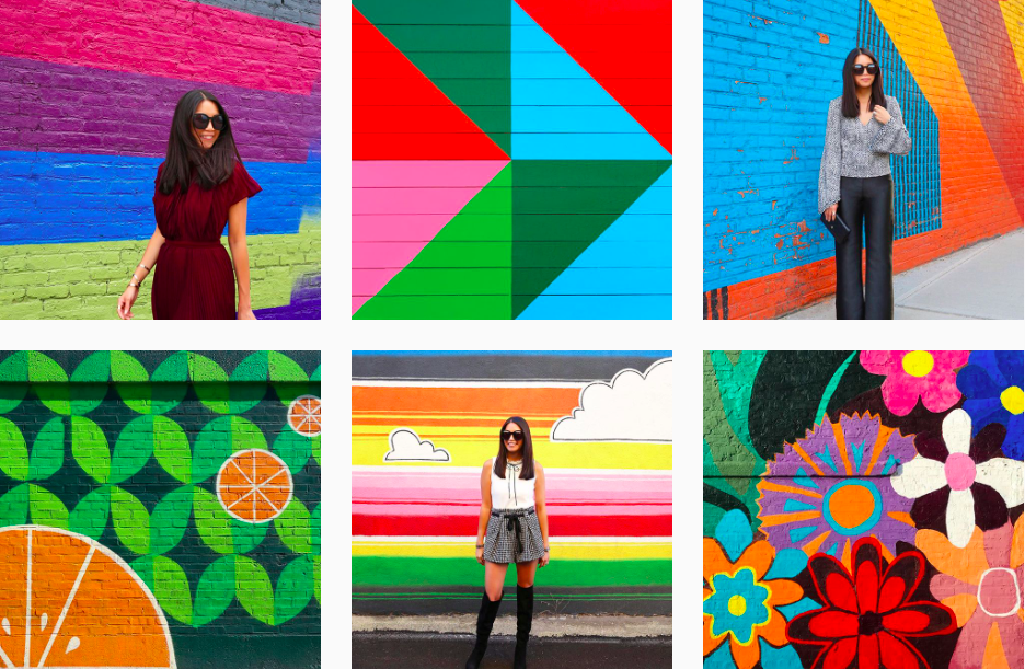 “I love how a pop of color can lighten your mood and brighten your day! Overall, I’m inspired by clean spaces, bold graphics, and interesting color combinations. I love finding and shooting abstract and colorful street murals in various cities, especially Chicago! I’ve included some fun, fashion photos to my feed to incorporate my love of retail and showcase my personal style. A lot of my flatlays feature candy and Summer themed objects like flamingos and watermelons.”